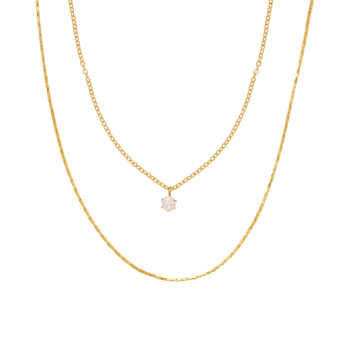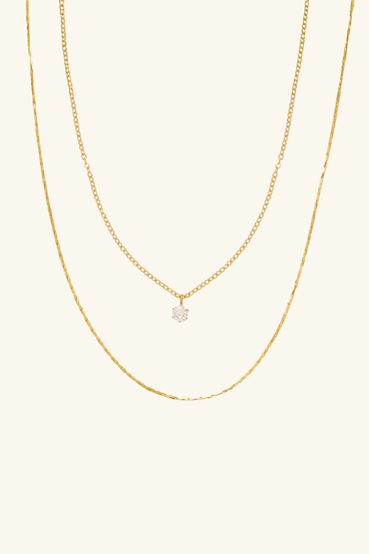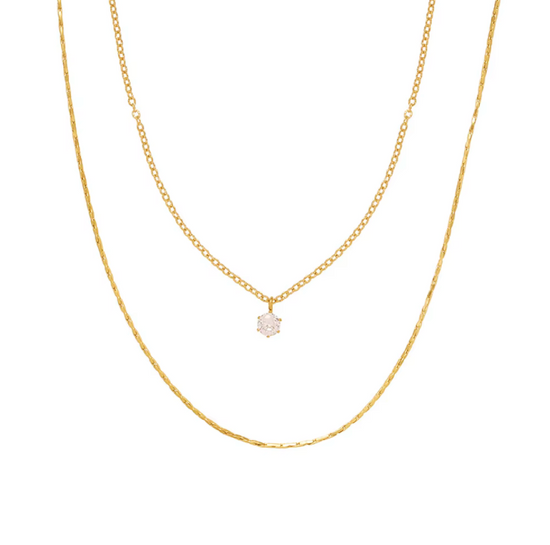 Hand crafted 18k gold plated double layer chain with petite clear cubic zirconia crystal pendant.