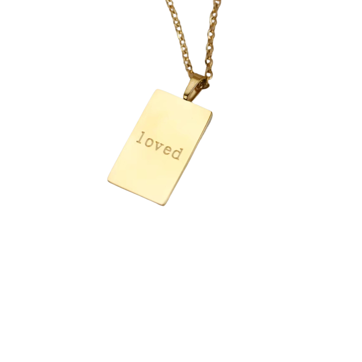 Hand made 18k Gold plated chain necklace with square pendant with the word "Loved" engraved.